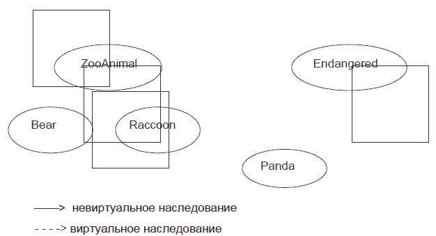 Рис. 18.2. Иерархия виртуального наследования iostream (упрощенная) Еще один реальный пример виртуального и множественного наследования дают распределенные объектные вычисления. Подробное рассмотрение этой темы см. в серии статей Дугласа Шмидта (Douglas Schmidt) и Стива Виноски (Steve Vinoski) в [LIPPMAN96b]. В данной главе мы рассмотрим использование и поведение механизмов виртуального и множественного наследования. В другой нашей книге, "Inside the C++ Object Model", описаны более сложные вопросы производительности и дизайна этого аспекта языка. Для последующего обсуждения мы выбрали иерархию животных в зоопарке. Наши животные существуют на разных уровнях абстракции. Есть, конечно, особи, имеющие свои имена: Линь-Линь, Маугли или Балу. Каждое животное принадлежит к какому-то виду; скажем, Линь-Линь – это гигантская панда. Виды в свою очередь входят в семейства. Так, гигантская панда – член семейства медведей, хотя, как мы увидим в разделе 18.5, по этому поводу в зоологии долго велись бурные дискуссии. Каждое семейство – член животного мира, в нашем случае ограниченного территорией зоопарка. На каждом уровне абстракции имеются данные и операции, необходимые для поддержки все более и более широкого круга пользователей. Например, абстрактный класс ZooAnimal хранит информацию, общую для всех животных в зоопарке, и предоставляет открытый интерфейс для всех возможных запросов. Помимо классов, описывающих животных, есть и вспомогательные классы, инкапсулирующие различные абстракции иного рода, например "животные, находящиеся под угрозой вымирания". Наша реализация класса Panda множественно наследует от Bear (медведь) и Endangered (вымирающие). 18.2. Множественное наследованиеДля поддержки множественного наследования синтаксис списка базовых классов class Bear : public ZooAnimal { ... };