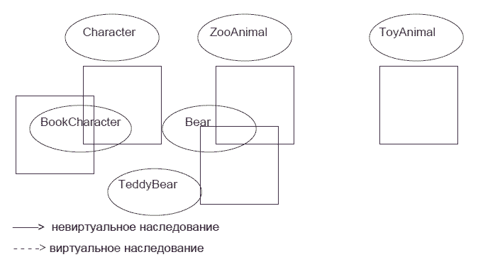 Когда ссылка или указатель на объект Bear или ZooAnimal инициализируется адресом объекта Panda или ему присваивается такой адрес, то части интерфейса, связанные с классами Panda и Endangered, становятся недоступны: Bear *pb = new Panda; pb->print( cout ); // i?aaeeuii: Panda::print(ostream&) pb->isA(); // i?aaeeuii: Bear::isA() pb->cuddle(); // ioeaea: yoi ia ?anou eioa?oaena Bear pb->highlight(); // ioeaea: yoi ia ?anou eioa?oaena Bear delete pb; // правильно: Panda::~Panda() (Обратите внимание, что если бы объекту класса Panda был присвоен указатель на ZooAnimal, то все показанные выше вызовы разрешались бы так же.) Аналогично, если ссылка или указатель на объект Endangered инициализируется адресом объекта Panda или ему присваивается такой адрес, то части интерфейса, связанные с классами Panda и Bear, становятся недоступными: Endangered *pe = new Panda; pe->print( cout ); // правильно: Panda::print(ostream&) // ioeaea: yoi ia ?anou eioa?oaena Endangered pe->cuddle(); pe->highlight(); // правильно: Endangered::highlight() delete pe; // правильно: Panda::~Panda() Обработка виртуального деструктора выполняется правильно независимо от типа указателя, через который мы уничтожаем объект. Например, во всех четырех инструкциях порядок вызова деструкторов один и тот же – обратный порядку вызова конструкторов: // ZooAnimal *pz = new Panda; delete pz; // Bear *pb = new Panda; delete pb; // Panda *pp = new Panda; delete pp; // Endangered *pe = new Panda; delete pe; Деструктор класса Panda вызывается с помощью механизма виртуализации. После его выполнения по очереди статически вызываются деструкторы Endangered и Bear, а в самом конце – ZooAnimal. Почленная инициализация и присваивание объекту производного класса, наследующего нескольким базовым, ведут себя точно так же, как и при одиночном наследовании (см. раздел 17.6). Например, для нашего объявления класса Panda class Panda : public Bear, public Endangered